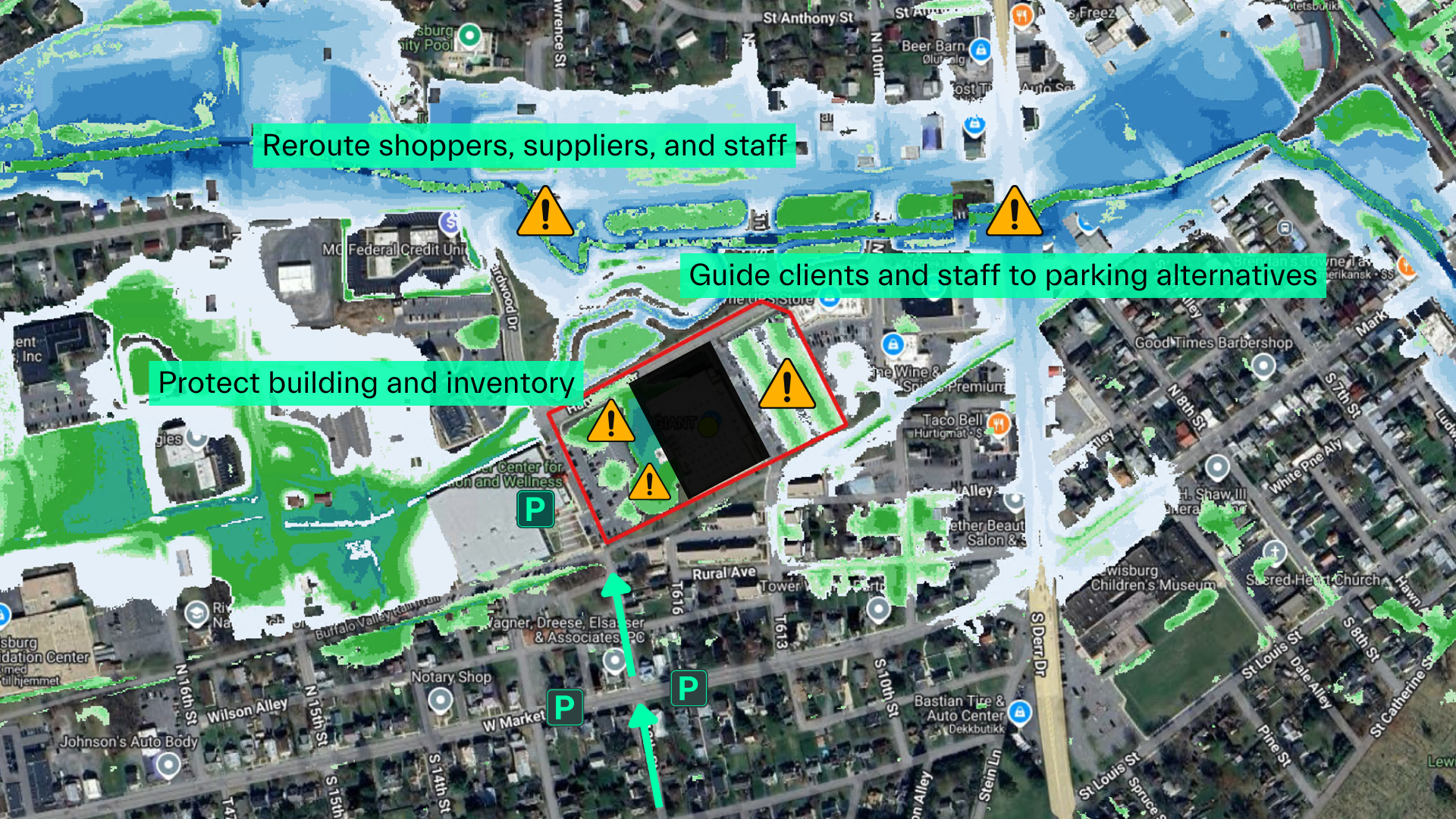Unlike traditional weather/meteorological forecasts that only describe what comes from above, real-time flood forecasting provides site-specific intelligence including flood depth, extent, timing, and duration up to 72 hours in advance with hourly updates. Our real-time forecasting and monitoring solution translates data into action, by empowering businesses to: